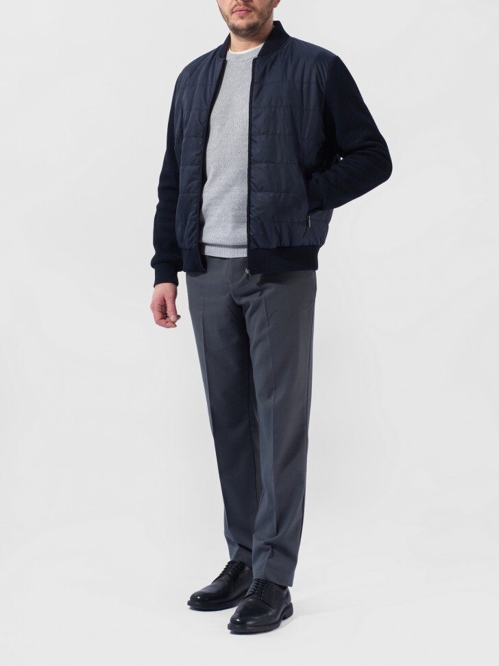 Классический бомбер оформлен горизонтальной строчкой, с трикотажными рукавами, отделкой из трикотажа на воротнике и по низу изделия. Застегивается на молнию в цвет изделия, карманы отделаны контрастной тканью.